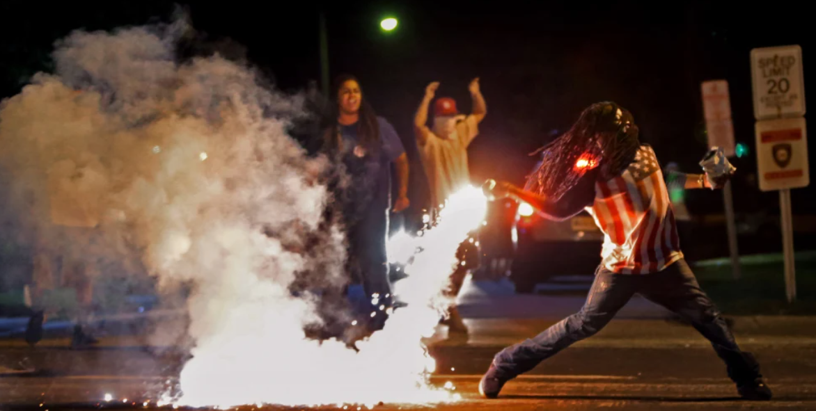 Edward Crawford returns a tear gas canister fired by police who were trying to disperse protesters in Ferguson, Mo., on Aug. 13, 2014.Robert Cohen / St. Louis Post-Dispatch via Zuma Press