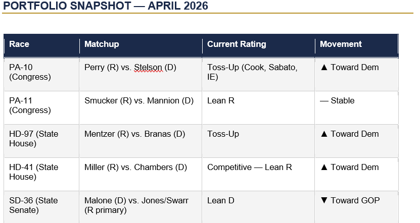 The May 19 primary is the first hard test. What comes out of it — unified, funded, and moving — determines how much of this environment converts. PA-10 is the race to watch. Stelson vs. Douglas has been a managed contest so far. It needs to stay that way.